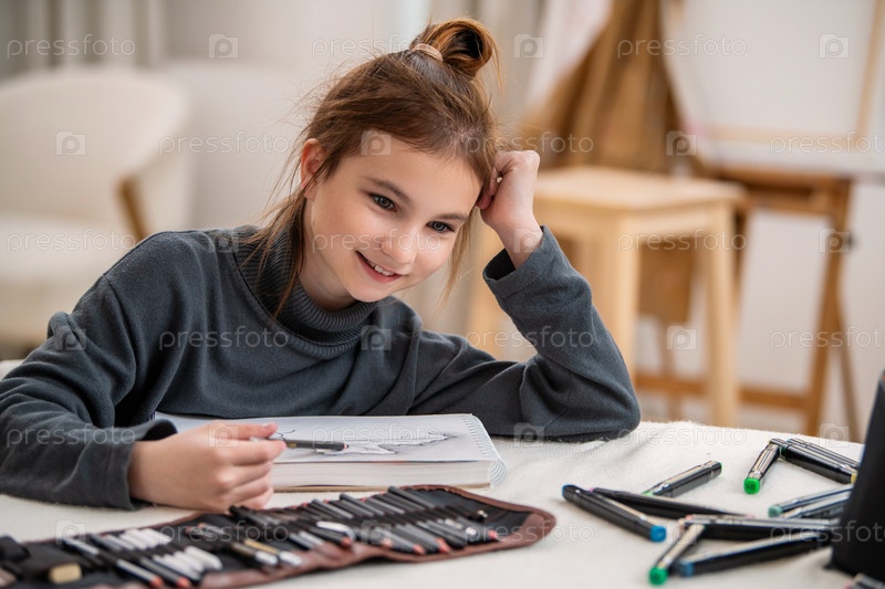 Девушка сидит за столом с блокнотом и сумкой карандашей. Она улыбается и держит в руках маркеры. Сцена предполагает, что она наслаждается творческой деятельностью