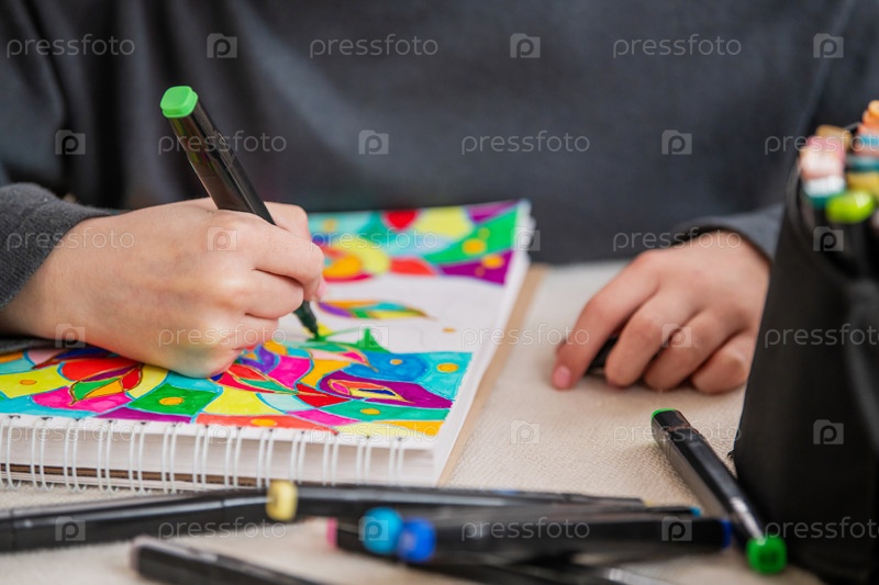 Человек рисует маркерами на листе бумаги красочную картинку. Рисунок кажется абстрактным и ярким, с множеством цветов и форм
