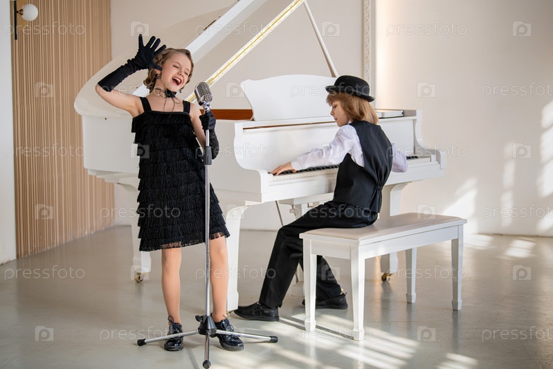 Девушка в черном платье поет в микрофон, а мальчик играет на пианино. Действие происходит в комнате с белым пианино и микрофоном. Сцена легкая и веселая