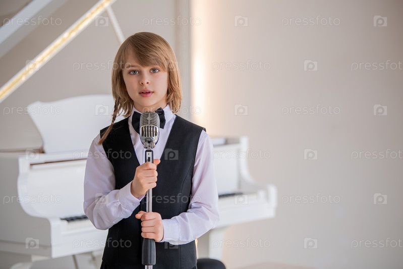 Мальчик в черном жилете и галстуке-бабочке поет в микрофон. он улыбается ей, и ей нравится петь