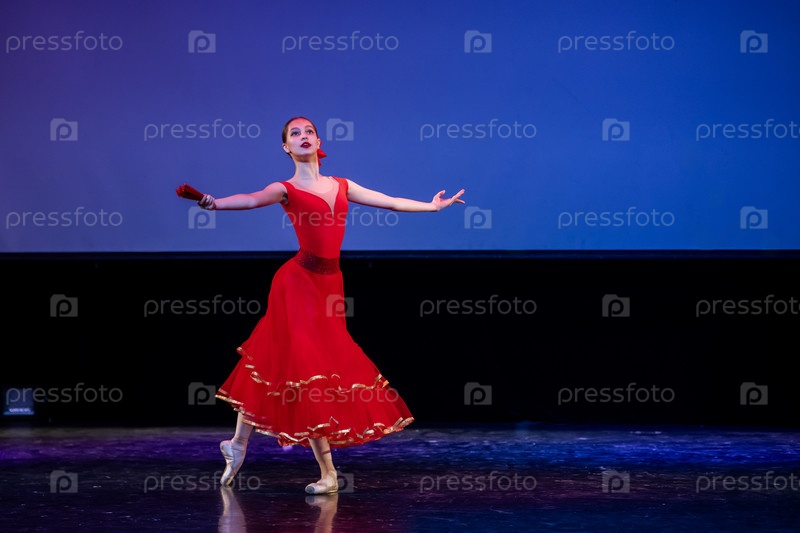 Юная балерина в красном платье с веером исполняет на сцене театра вариацию из балета «Дон Кихот»