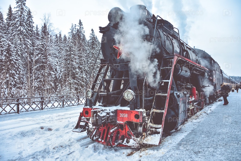 Карелия, Россия - 04 февраля 2022 года: Рускеала Экспресс, фирменный ретро-поезд
