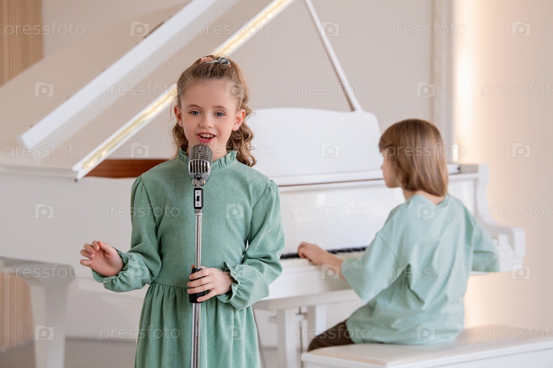Девушка поет в микрофон перед фортепиано. Мальчик сидит на скамейке позади нее и сопровождает ее