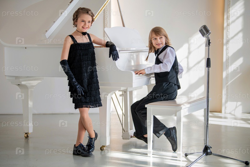 Двое детей, одетых в черно-белое, позируют перед фортепиано. Сцена игривая и беззаботная: дети одеты в официальные наряды и, кажется, развлекаются
