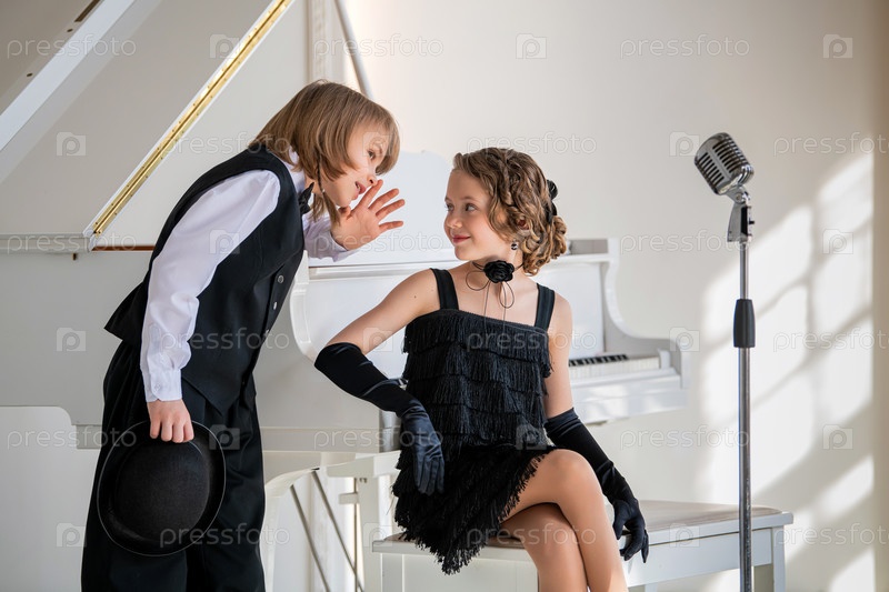 Двое детей, одетых в черно-белое, позируют перед фортепиано. Сцена игривая и беззаботная: дети одеты в официальные наряды и, кажется, развлекаются