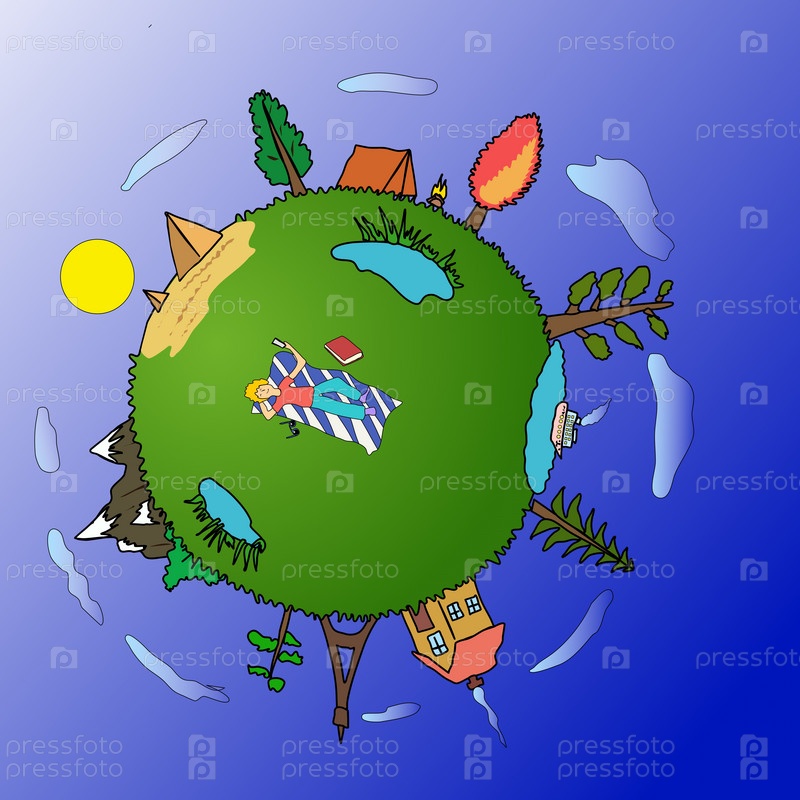 Маленький круглый мир, планета Земля, в центре которой на траве лежит мальчик с телефоном, книгой и очками