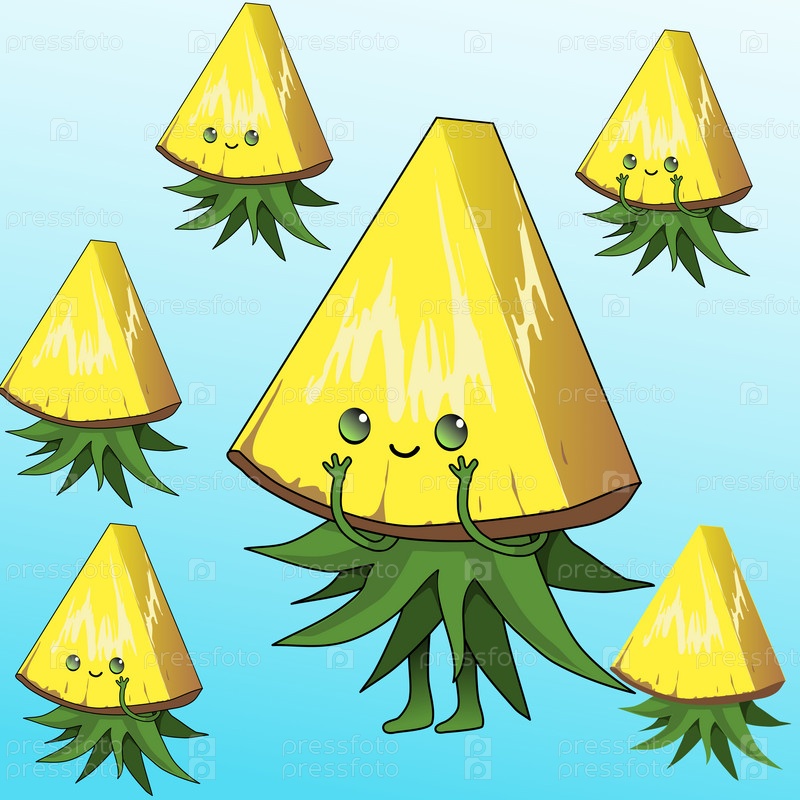 Несколько кусочков ананаса треугольной формы с лицом и милой улыбкой. Также кусочек ананаса без улыбки и без штриха одним файлом