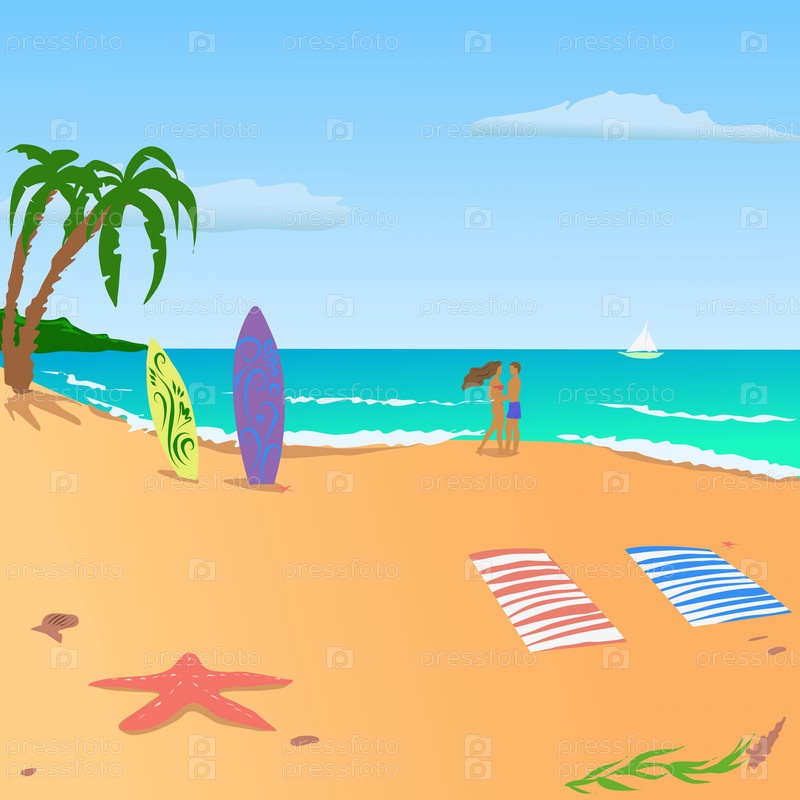 Двое влюбленных стоят на берегу моря на песчаном пляже рядом с досками для серфинга