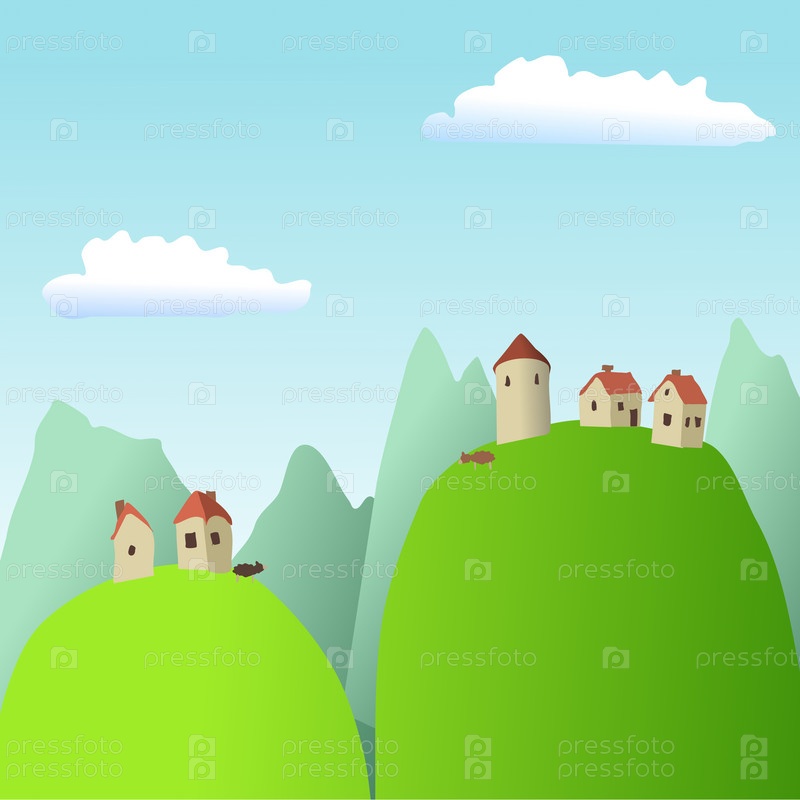 Зеленые травянистые горы на фоне горного пейзажа и домиков вдалеке