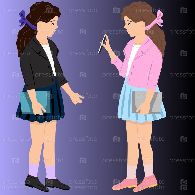 Иллюстрация школьницы, общающейся на прозрачном фоне. девушки одеты в летние юбки и куртки короткой модели