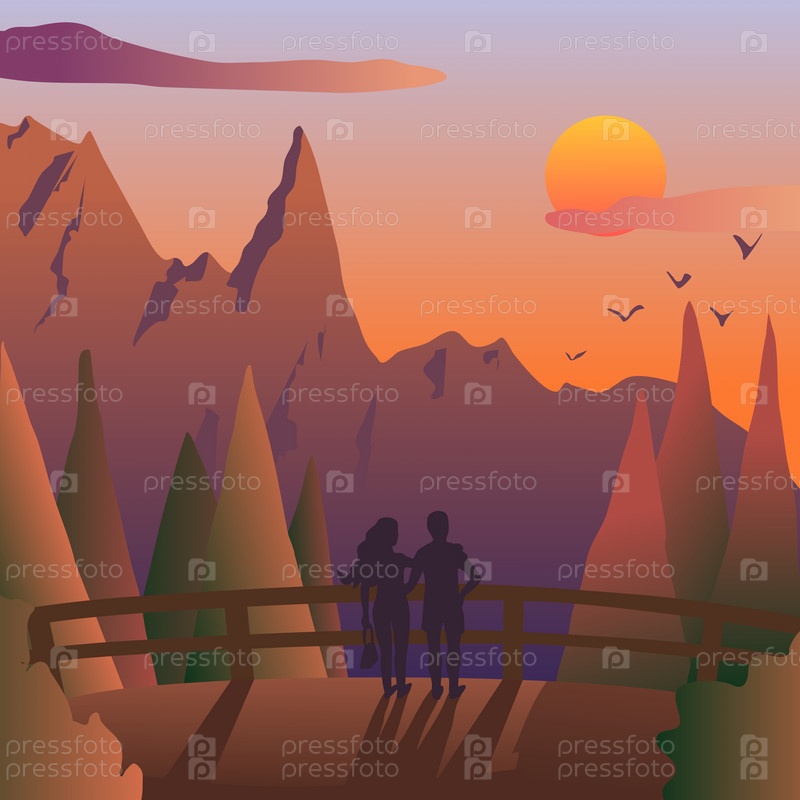 Молодой мужчина и женщина остаются вместе в горах на закате, глядя на горные хребты и леса, над которыми солнце уже становится оранжевым