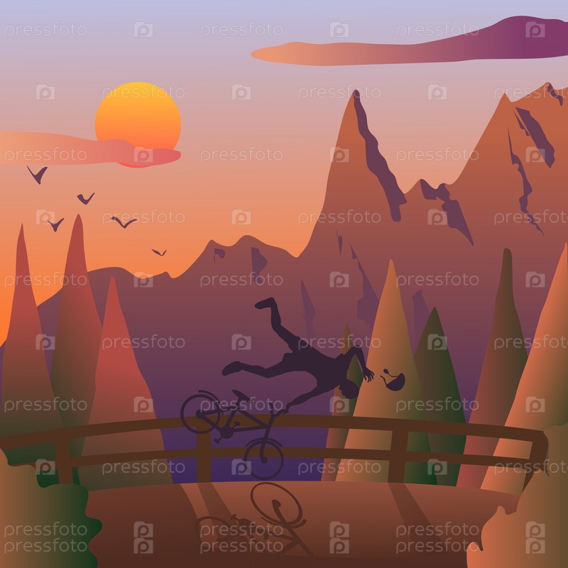 У дороги стоит забор. Велосипедист врезался в забор. Мужчина летит в пропасть, упав с велосипеда