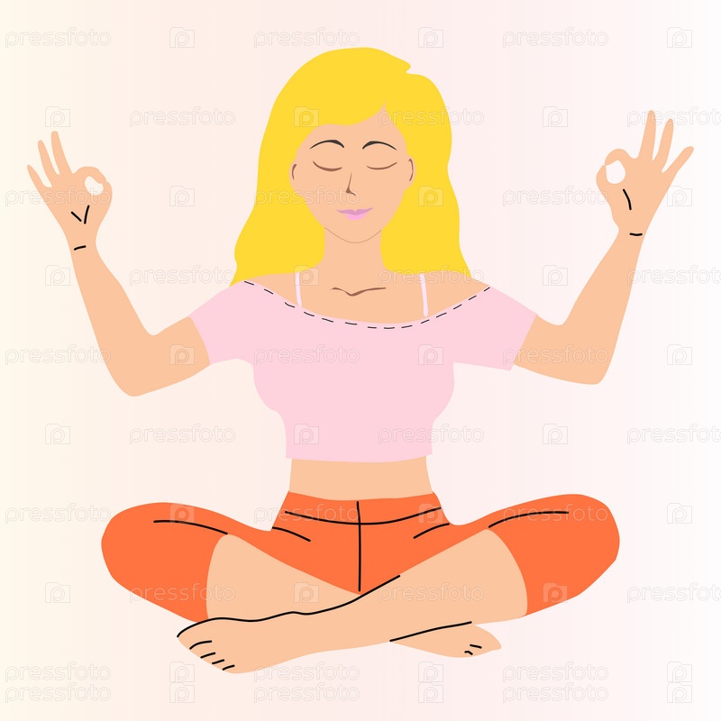Гламурная блондинка в позе медитации. оранжевый низ и розовый верх. Пальцы сложены вместо указательного и большого пальцев