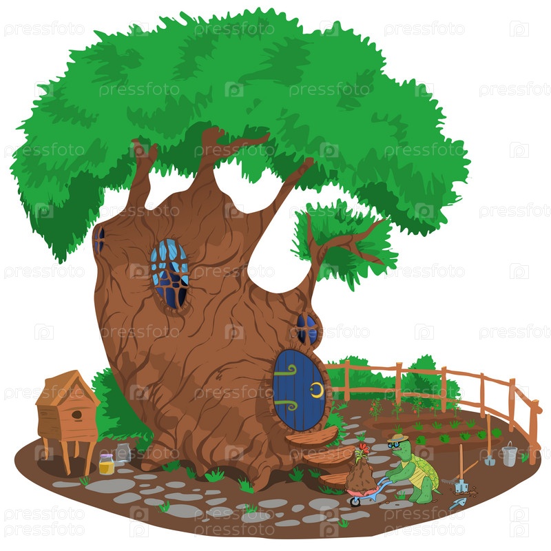 Книжная иллюстрация фермера-черепахи, тянущего тележку с цветком возле своего домашнего дерева