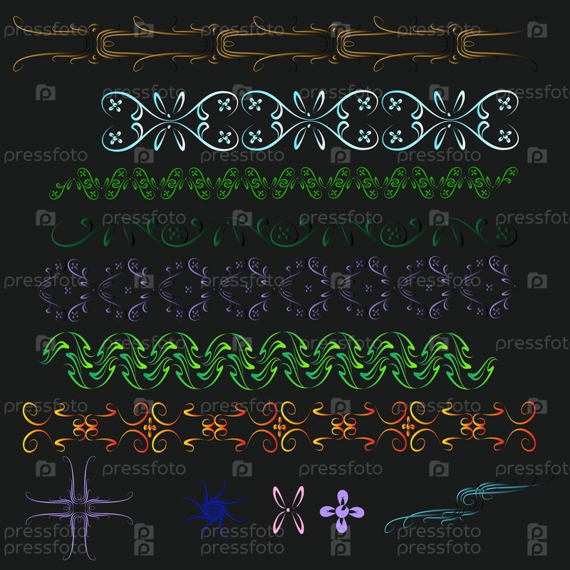 Разные узоры из ленты в растительном формате. Повторяющиеся закорючки с цветами и лепестками разных цветов на прозрачном фоне
