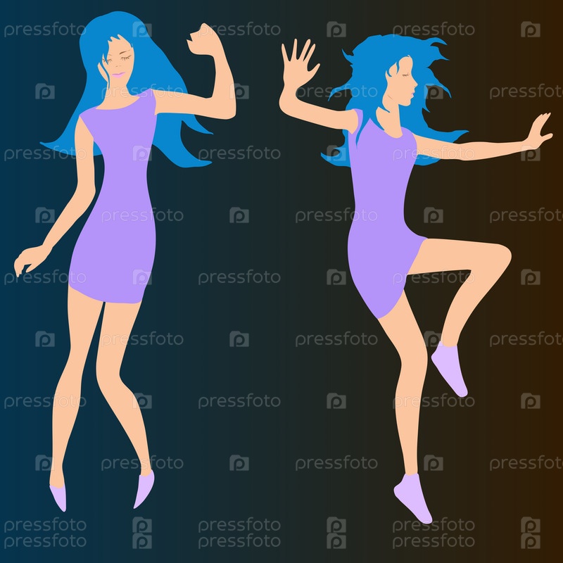 Девушка с длинными волосами в клубном платье самозабвенно танцует. фиолетовое платье и синие длинные волосы. Две танцевальные позы в свободном стиле