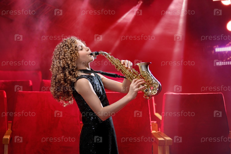 Молодая девушка-музыкант держит саксофон и улыбается. Она одета в черное платье и стоит на красном фоне в центре внимания