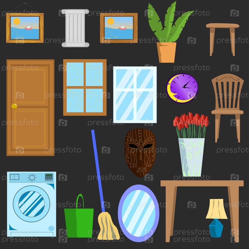 Общая домашняя обстановка, включая окна и двери. прозрачный фон