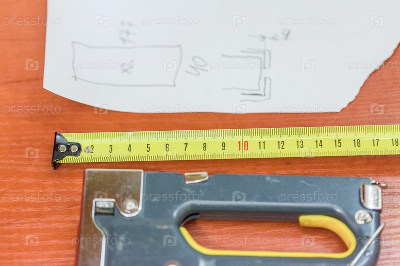Рисунок с расчетами и желтой метрической лентой на столе, крупный план, размытый фон