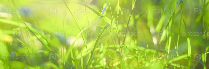 Зеленая трава с каплями росы под утренним солнцем, крупный план, размытый фон