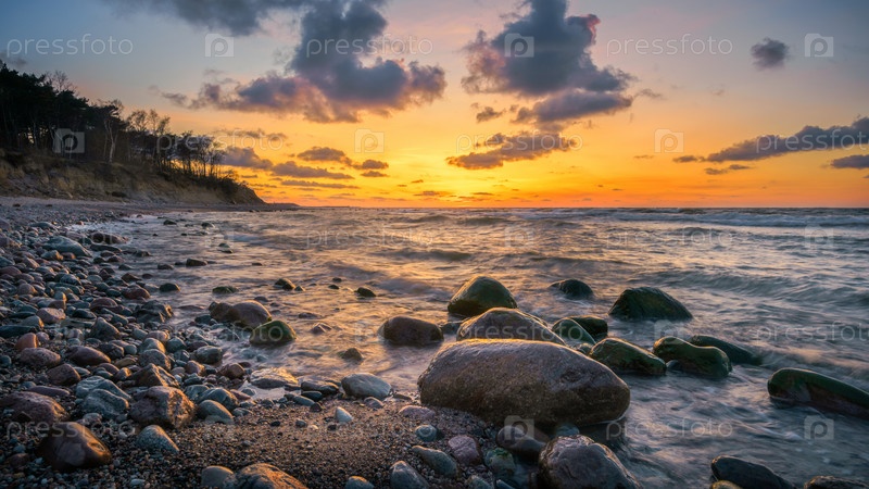 Чудесный оранжевый закат на скалистом побережье моря