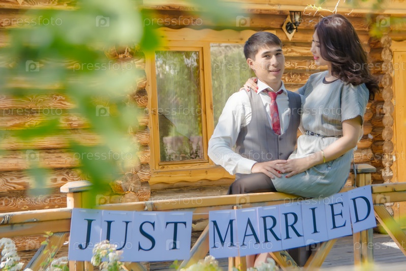 Парень и девушка азиатской национальности киргизы на природе, на фоне гор. держат табличку, баннер молодожены, молодожены