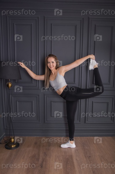 Девушка фитнес-тренера европейской национальности, выполняет упражнения