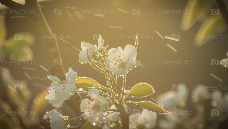 Весенняя цветущая яблоня, цветы яблони на закате в каплях дождя