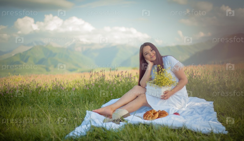 Девушка азиатской национальности, кыргызка, позирует на пикнике в горной местности на природе в белом платье