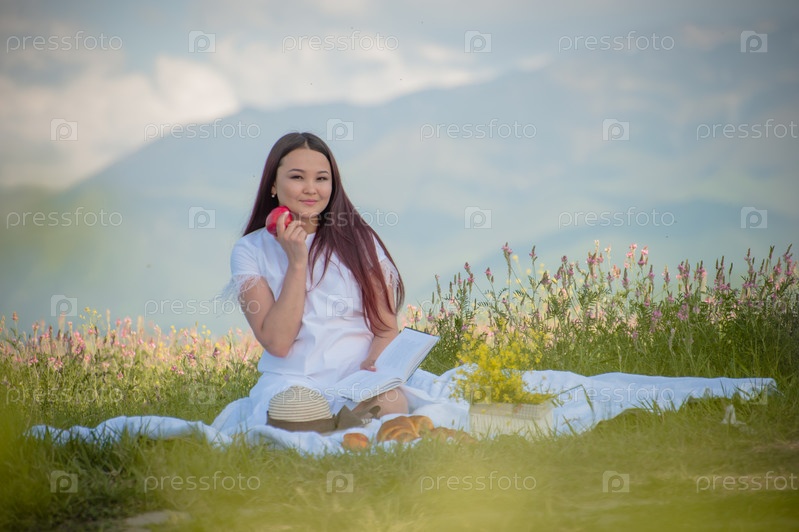 Девушка 20-25 лет весной и летом сидит в поле на природе на пикнике в шляпе и белом платье, ест фрукты и читает книгу