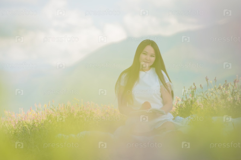 Девушка 20-25 лет весной и летом сидит в поле на природе на пикнике в шляпе и белом платье, ест фрукты и читает книгу