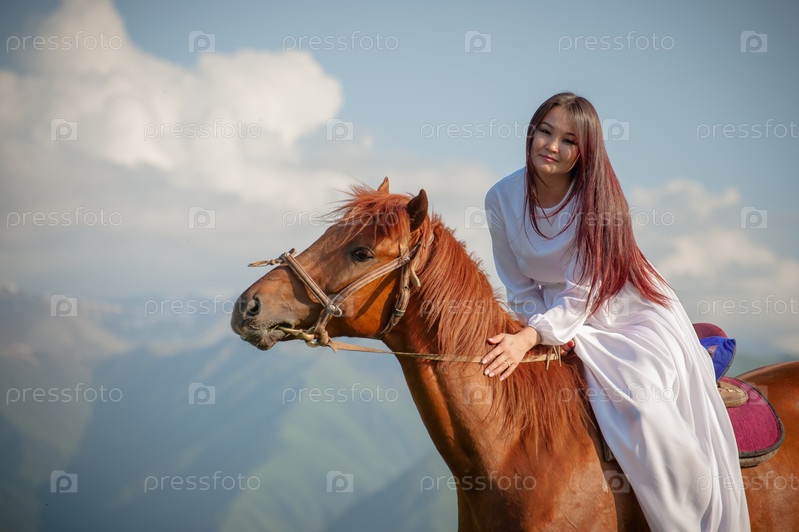 Кыргызская девушка азиатской национальности скачет на лошади в белом платье