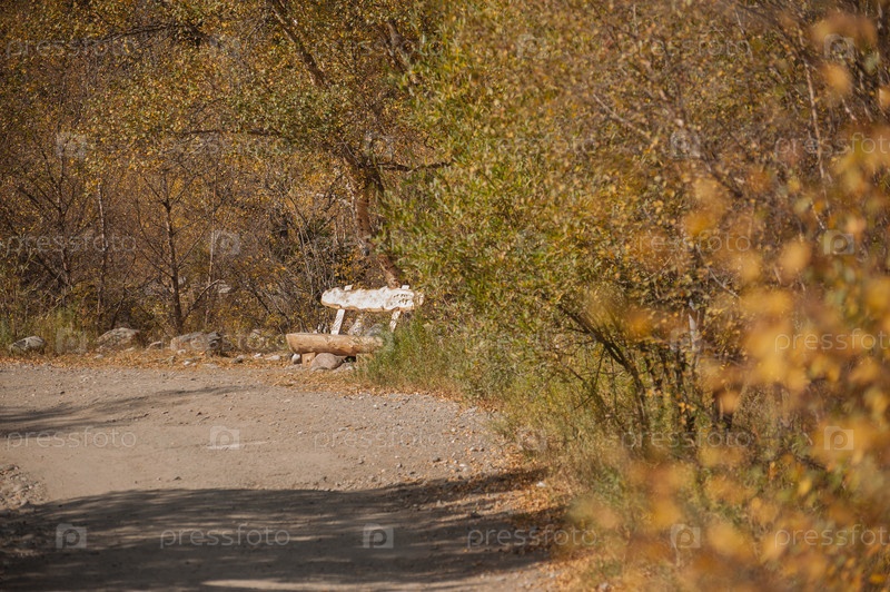 Скамейка из ствола дерева в горном парке