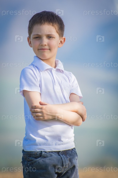 Портрет 7-летнего мальчика, европейского гражданства, русского, позирующего на природе на размытом фоне