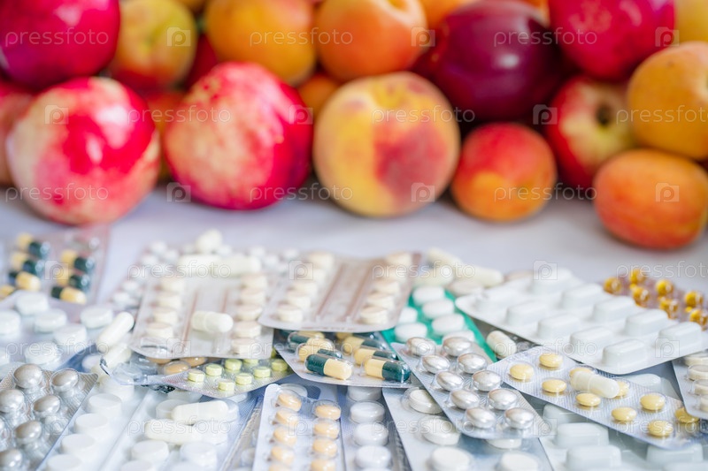 Куча таблеток, лежащих рядом с кучей фруктов, размытый фон