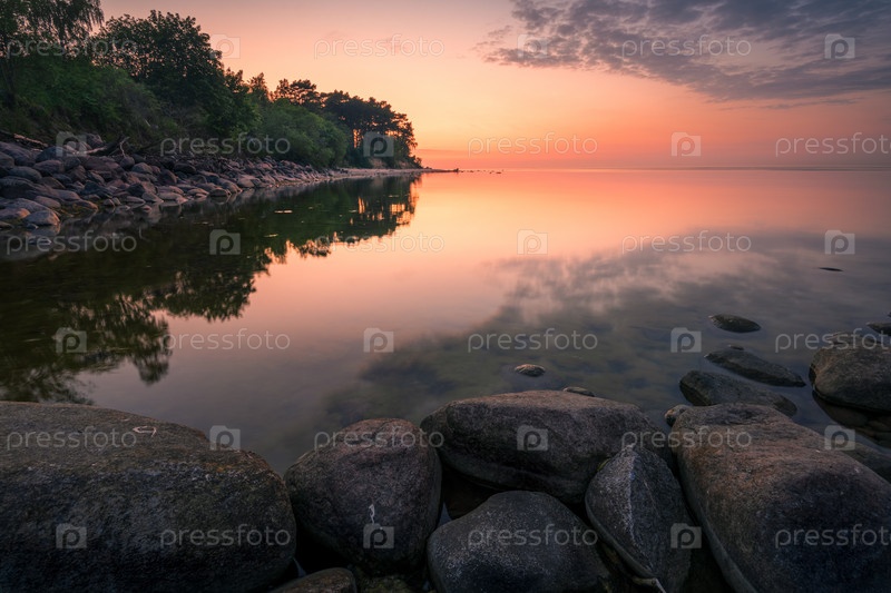 Чудесный красочный закат на спокойном море со скалистым берегом