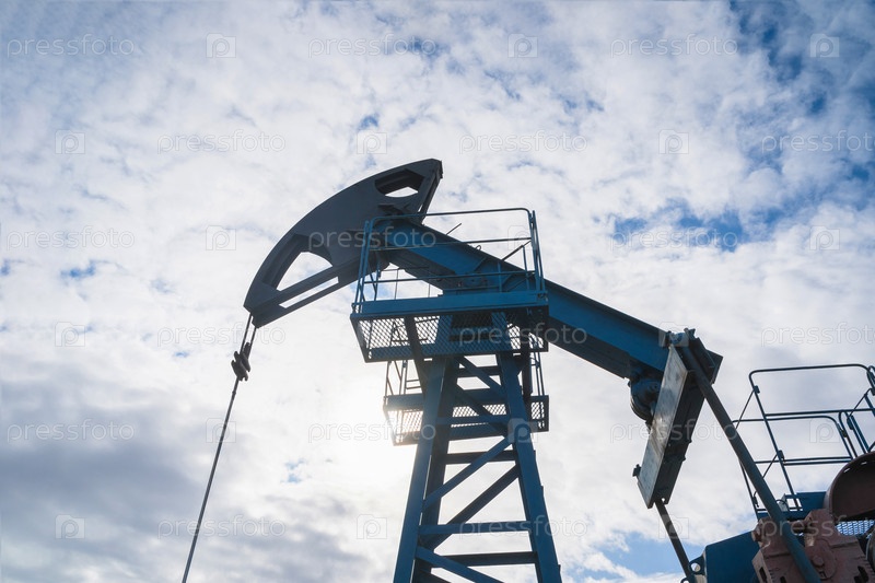 Масляный насос на фоне голубого неба и утреннего солнца, солнечные блики на масляном насосе