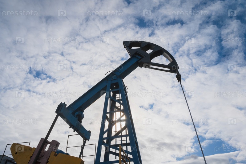 Масляный насос на фоне голубого неба и утреннего солнца, солнечные блики на масляном насосе