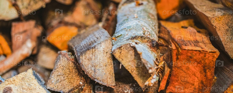Дрова, сложенные в поленницу, размытый фон, текстура