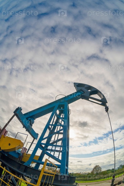 Масляный насос на фоне голубого неба и утреннего солнца, солнечные блики на масляном насосе