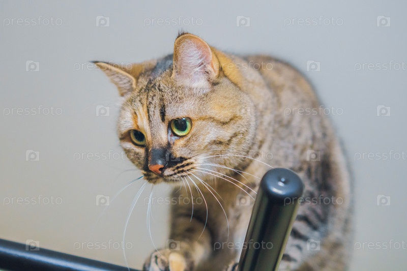 Кот забрался на очень высокое место и выглядит очень довольным, вид снизу