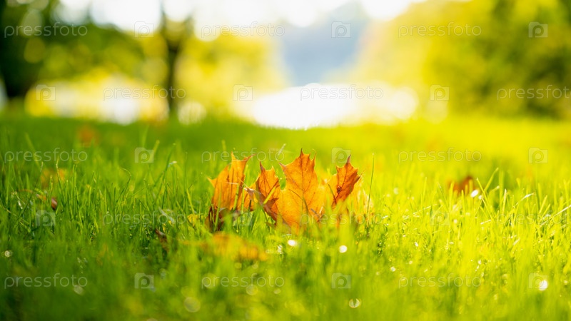 Опавшие желтые листья на траве под ярким осенним солнцем