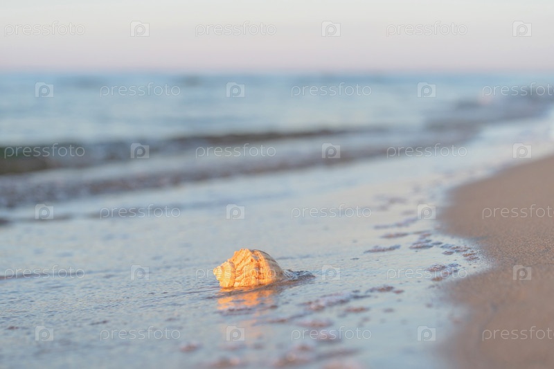 Красивая ракушка лежит на пляже, рядом с лазурной водой моря