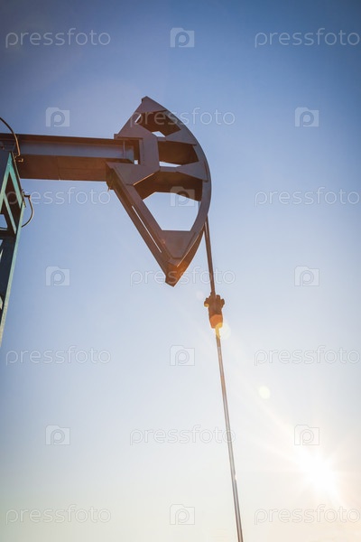 Масляный насос на фоне голубого неба и утреннего солнца, солнечные блики на масляном насосе