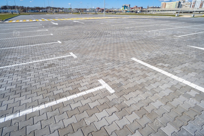Открытое пространство с дорожными знаками и дорожной разметкой, дорожными перекрестками, пешеходными переходами, солнечным днем, голубым небом, фоном городского пейзажа