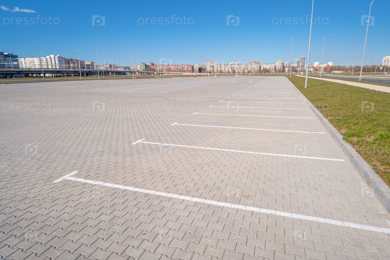 Открытое пространство с дорожными знаками и дорожной разметкой, дорожными перекрестками, пешеходными переходами, солнечным днем, голубым небом, фоном городского пейзажа