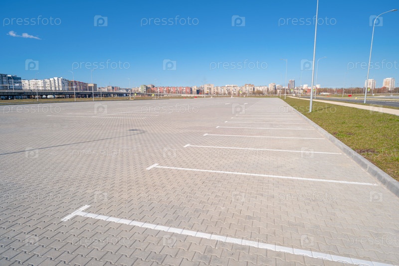 Открытое пространство с дорожными знаками и дорожной разметкой, дорожными перекрестками, пешеходными переходами, солнечным днем, голубым небом, фоном городского пейзажа