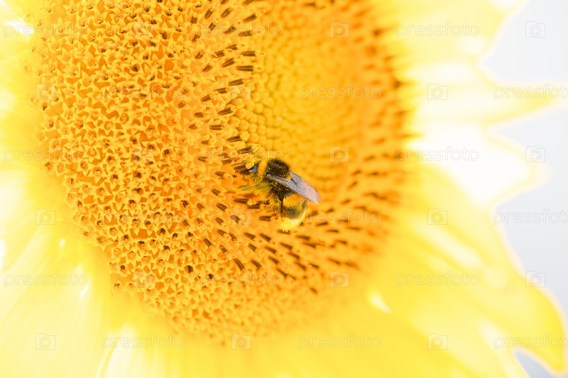 Милый мохнатый шмель сидит на подсолнухе в ясный солнечный день, позитивный образ