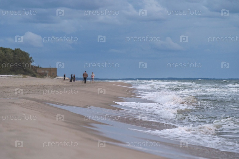 Песчаный осенний пляж, волны на море и облака на заднем плане