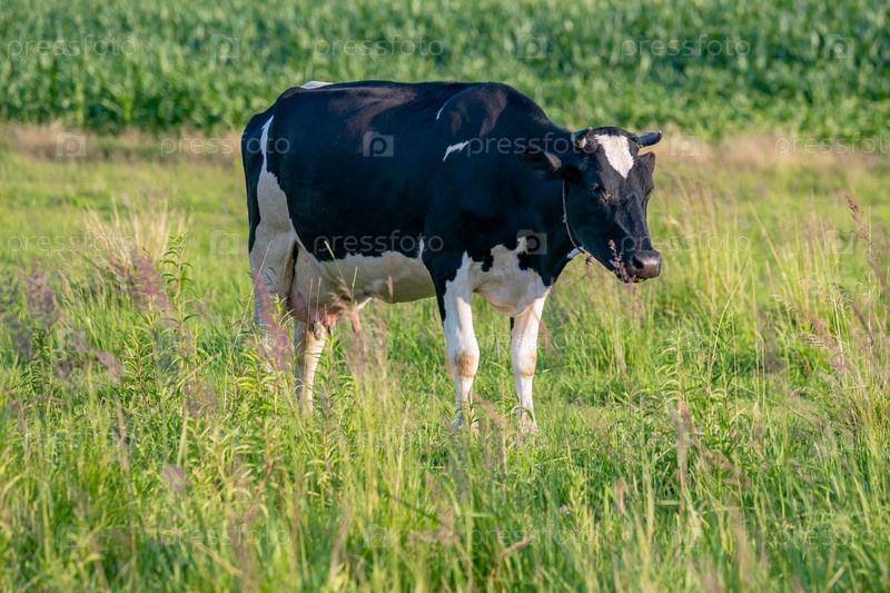 Коровы пасутся на сочном лугу в летний день